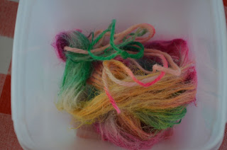 Pääsiäisen alla sain idean kokeilla voisiko lankaa värjätä virpomisesta yli jääneillä silkkipaperin paloilla. (tunsin vuonna viisi ja nappi tytön, joka värjäsi hiuksensa silkkipaperilla - ja väri pysyi viikkoja! )